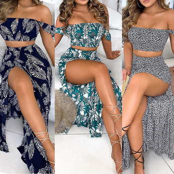 2 pieza Floral de las mujeres Crop Top y falda conjunto de fiesta de verano de dos piezas vestido de gasa