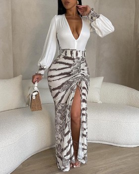 Novedades 2023 Ropa de dama Cuello en V Manga larga Vestido elegante Mujer Vestidos y faldas estampados